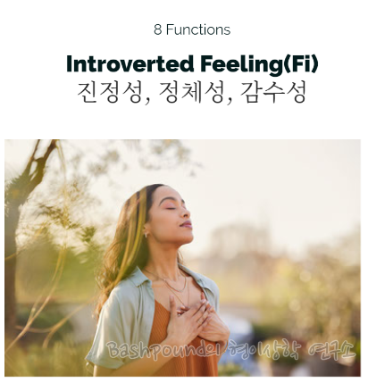 - 이 기능이 주기능인 유형(ISFP, INFP)들은 자신만의 감성이 존재하고, 자기 자신에게 솔직하며 때론 자기에게 지나치게 관대한 모습을 보이기도 합니다. 이들에게 '나'란, '나에게는 언제나 옳은 존재'이기 때문이죠. 타인도 응당 그럴 것이라 생각해 개인주의적인 성향이 있습니다.